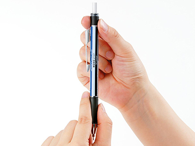 ラバーグリップにより長時間の筆記による疲れを軽減。上下に振れば芯が出るので、筆記中の持ち替えも必要なし。