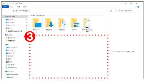 ❸最近使ったファイルの機能自体を止めてしまうと、クイックアクセスを開いても、下部に何も表示されない。