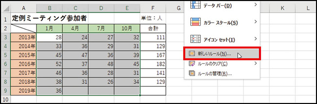 ここではわかりやすく、参加人数が30~39人のセルを水色にしてみた。条件を変えて、より複雑なルールに合致したセルを見つけ出すこともできる。