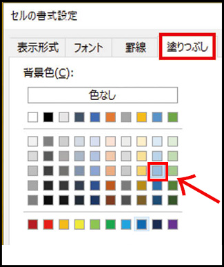 ❸「セルの書式設定」で「塗りつぶし」タブを選び、希望の色を選んで「OK」。「書式ルール」の画面も「OK」で閉じる。