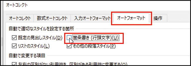❹「オートフォーマット」タブで「箇条書き(行頭文字)」のチェックを外し、すべての画面を「OK」で閉じる。