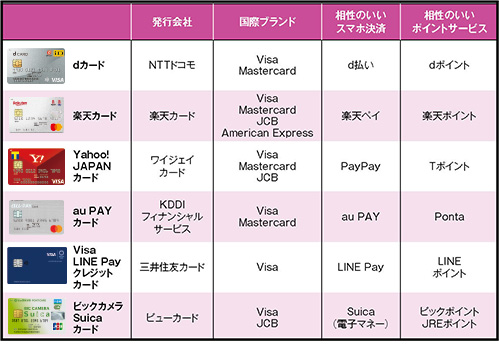 日本クレジット協会によると、2億8394万枚(2019年3月末時点)が発行されている。中でも、人気は通信系、交通系、流通系で、ここでは、スマホ決済や電子マネーと相性のいい6種のカードを紹介する。また、今ではICチップ付きが当たり前だが、さらに安全性を高めた非接触型カードも増加。ポイントカード機能を備えるカードも多い。