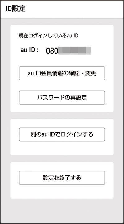 au IDの場合、確認・設定は、「設定」→「au設定メニュー」で行う。初期設定ではau IDは電話番号で、自動発行されたパスワードは変更可能。