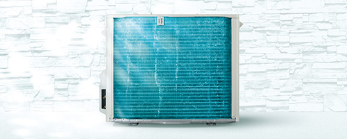 熱交換器を凍らせて霜を付け、一気に溶かして汚れを洗い流す独自方式で、油汚れにも強い。1回にかかるコストは約7円。最新モデルでは、室外機にも採用された。