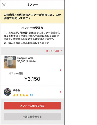 家電やインテリアなど一部のカテゴリーでは「オファー機能」があり、購入希望者が出品者に値引きを依頼できる。可否は出品者が決め、24時間の購入期限がある。