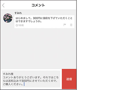 購入希望者とのやり取りは、商品ページのコメント欄で行う。価格の交渉で値下げを希望され、いわれた価格に応じられない場合は、いくらならいいかを提示しよう。
