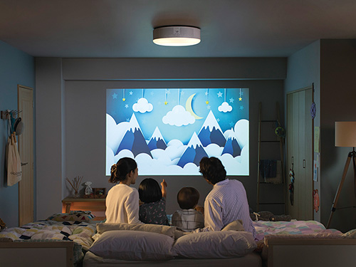 短焦点プロジェクターを内蔵したLEDシーリングライトで、4~10畳で60~100型程度の大画面投映が可能。フルHD画質で、映画やドラマの鑑賞にも適する。