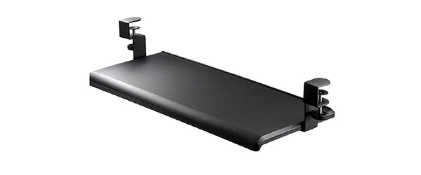 ネジ不要で簡単に取り付けられるクランプ式。キーボードとマウスを乗せて、引き出しのように出し入れできるので、スペースの有効利用に役立つ。