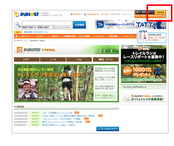 「ランネットトレイル」のトップ画面。右上の「新規登録」から会員登録をしよう