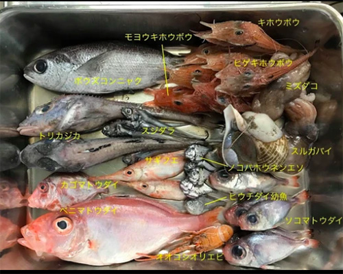 送られてくる魚はさまざま。ほんの一例ですが、ユメカサゴ・アカカサゴ・メヒカリ・ニギス・シロムツ・クロムツ・ツボダイ・ギンメダイ・トウジン・カナド・カガミダイ・チゴダラ・カゴカマス・コシオリエビ・アカザ海老・ミノエビ・アカエビ・ボタンエビ、ヒゲナガエビなどを味わうことができるそう。