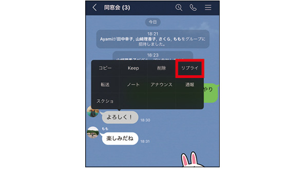 そんなときは「リプライ」機能を使って、どのトークに対する返事なのかを明確にしよう。リプライするには、返信したいトークを長押しして、「リプライ」を選択。あとは返事を入力して送信する。