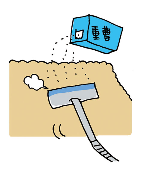 カーペットに重曹をそのまま振りかけ、二層スポンジの堅い面を使って全体にいきわたらせます。そのあと、掃除機で重曹を吸い取れば、ほこりやにおいが取れます。布製のソファも同じように掃除できます。