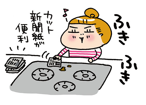 使ったあとは、時間をおかないこと。油の汚れに新聞紙を置くと吸着してくれるので、ハガキ大にカットしておくと使い捨てできて便利です。