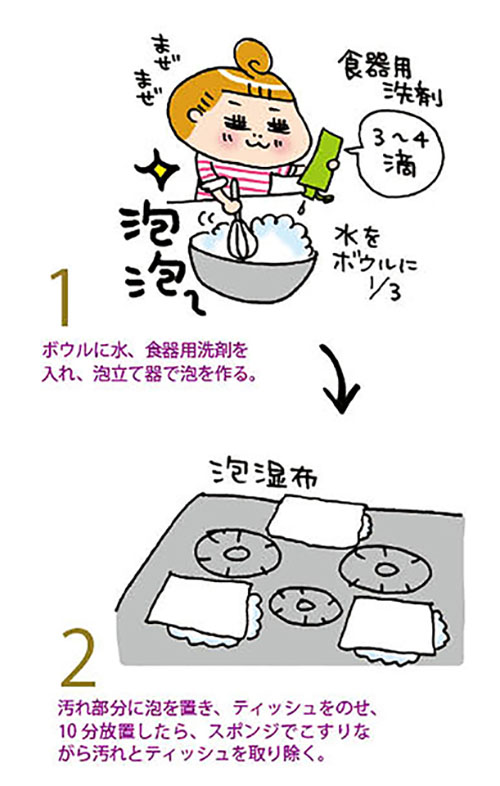毎日使う食器用洗剤で泡湿布。油汚れを浮かして取ります