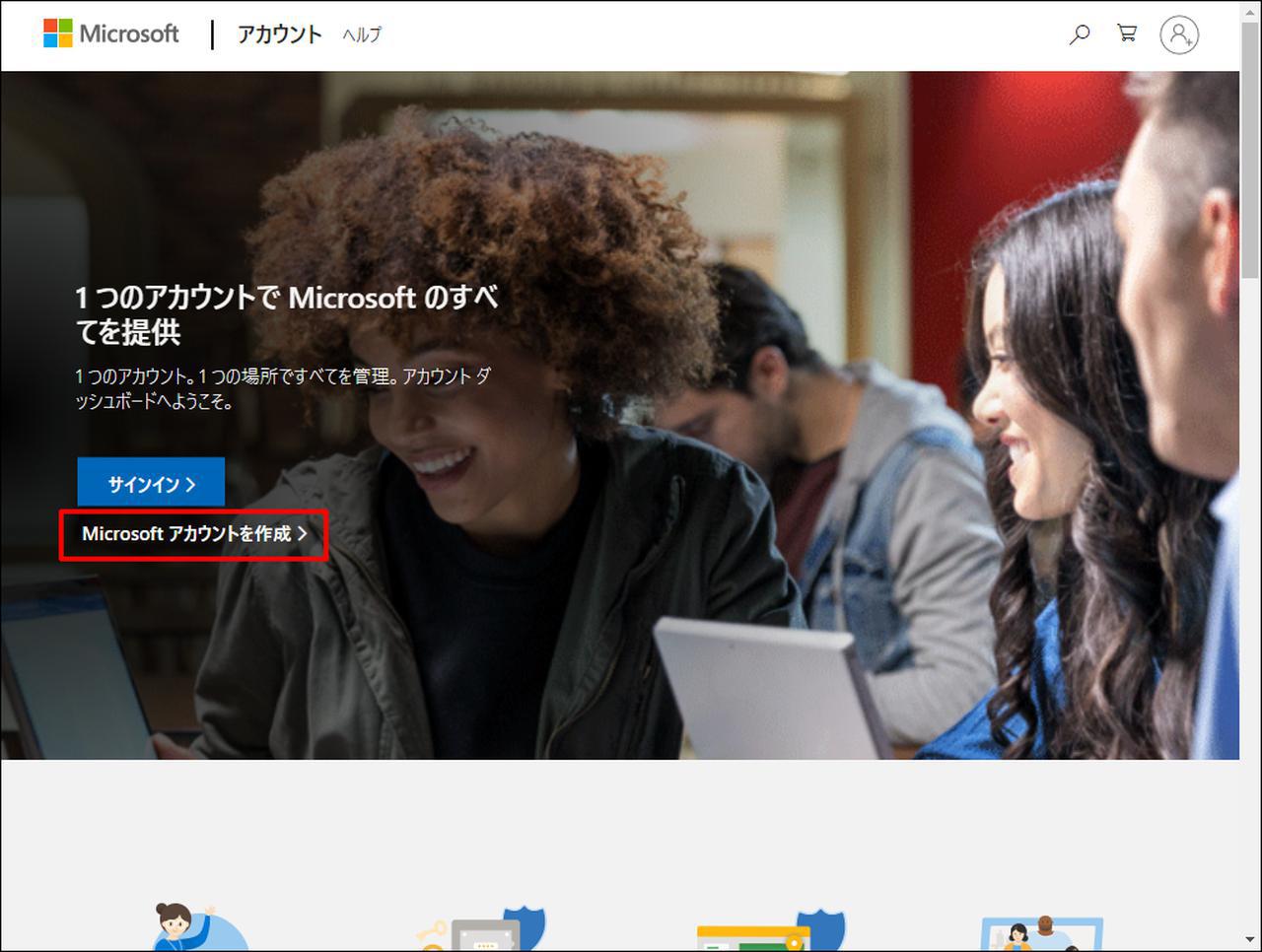 サイトにアクセスしたら、「Microsoft アカウントを作成」をクリック。