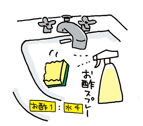 白いうろこ状の汚れが落ちない場合は、お酢スプレーをかけてティッシュで湿布します。1〜2時間放置したらティッシュを取り、水拭き→から拭きで仕上げます。