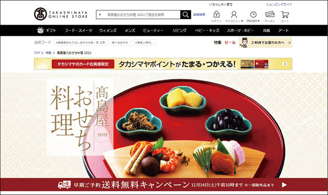 有名料亭や名店のおせち、高島屋限定のおせちなどがそろう。配送地域によって注文できる商品が異なる点に注意。