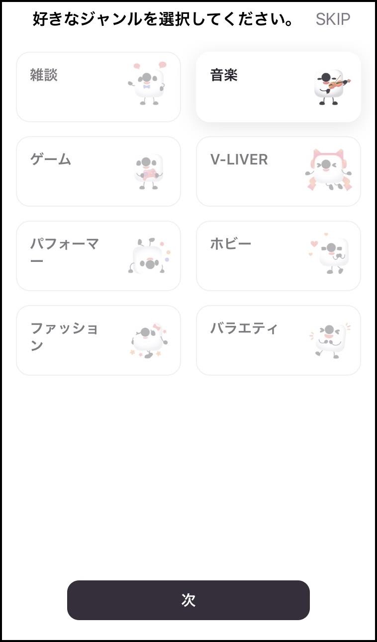 さいごに、自分の好きな「ジャンル」を選択します。すると、ジャンル別のおすすめアカウント(イチナナライバー)が自動で提案され、気になる配信者がいればフォローできます。特に目的が無い方はスキップしても構いません。