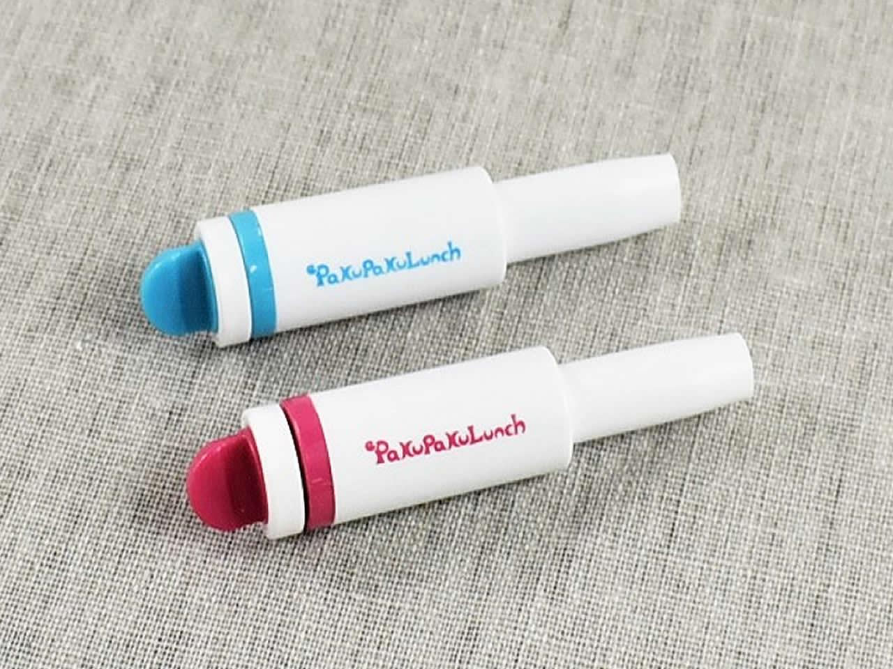 ピンクとブルー2種類がセットになった、ペンのような形の同商品。取っ手のついた押し出し棒と、「PaKuPaKuLunch」という可愛いロゴが入った筒の2パーツで構成されています。2本ともABS樹脂でできており、長さは約6.9cmほど。収納場所に困らないサイズがとてもありがたいですね。見た目にはほとんど同じデザインの2本ですが、唯一異なるのが先端の形状。ピンクが丸型、ブルーがオーバル型になっており、用途に合わせて使い分けることが可能です。