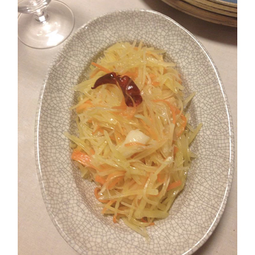 魚のあんかけソースも。人参、セロリ、竹の子などの千切り野菜たっぷりに、米酢に香酢を混ぜてあんかけを作ります。また、レモンと混ぜて、お砂糖と塩を混ぜると、例えば大根と大葉などの野菜と和えても美味しいですし、そのソースに水で戻した切り干し大根を漬けても美味しいです。