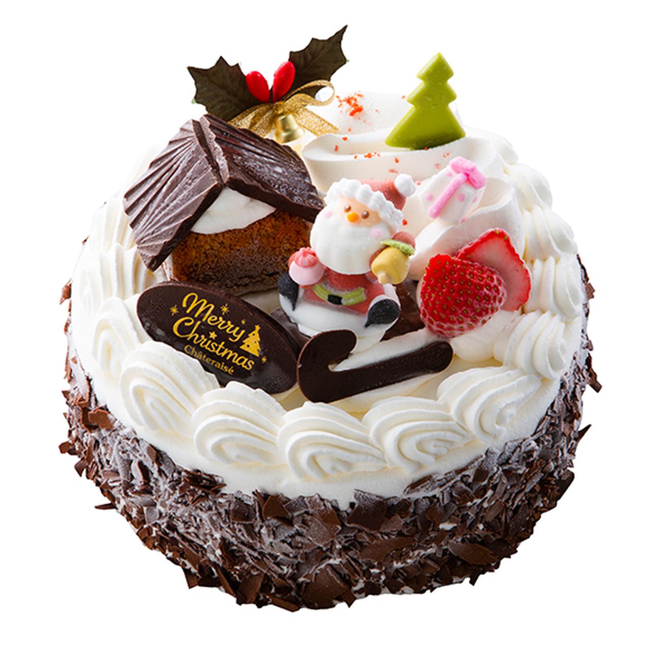 サンタさんのお家の中はチョコクリームデコレーション。ケーキの土台は、しっとりとしたスポンジにホイップクリームと洋梨・黄桃のシロップ漬け、苺をサンド。2種類の味をたっぷり楽しめます!