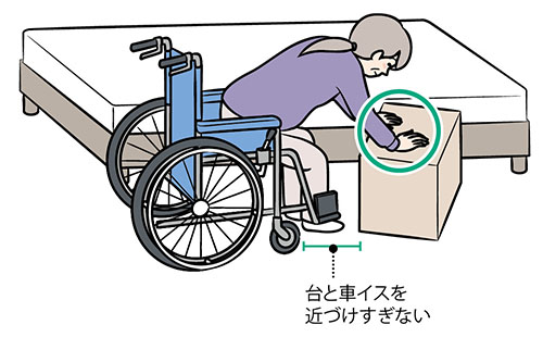 車イスの反対側に適切な高さの台を置くと、スムーズに移乗できます。台の上に手をついて、両手で台を押しながら立ち上がりましょう。台の代わりにベッドに取り付ける「移動用手すり」を使っても便利です。