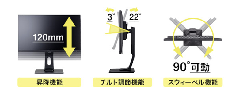 さて、このディスプレイにはもう一つ特徴があります。それは縦置き可能なことです。WEBを専門にしている方など、よく使われていますね。横置きで設置後、角度を目一杯ふることにより、そのままの状態で横向きから縦置きにも変更できます。実によくできてます。