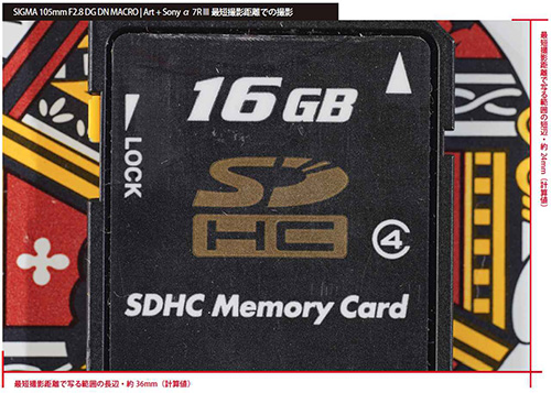 マクロレンズの最短撮影距離と最大撮影倍率の実写チャートには、一般的なブリッジサイズのトランプ(約57×89mm)のカードを背景に、多くの方が普段から撮影に使っているであろうSD メモリーカード(約24×32mm)を貼り付けたものを使用しています。