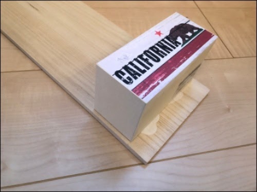 蓋部分に取っ手があると使いやすいかもと思い、ジェンガを拝借。ボンドでくっつけて乾かします。乾いたら蝶番をビスで打ち付けて、背板と合わせます。