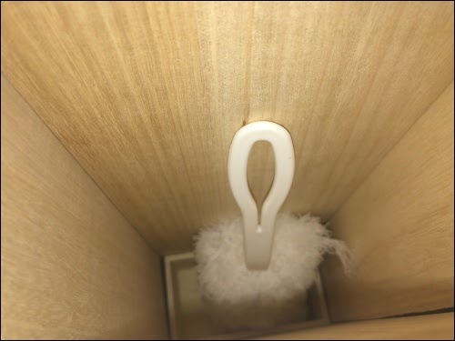 木箱の位置はお好みでOKですので、ハンディモップが取りやすい高さにしましょう。ボンドが乾いたら、釘を打ちます。