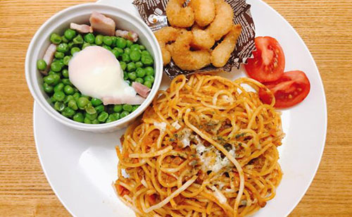 パスタは4種類あります。「ミートソースボロニア風(390円)」「タラコソースシシリー風(390円)」「パルマ風スパゲッティ(390円)」「ペペロンチーノ(290円)」と味のバリエーションが豊富。とにかく麺のボリュームがたっぷりで一皿でも十分にお腹が満たされます。今回は、ジューシーな牛肉の旨みを活かした特製ソースがたっぷりのミートソースをセレクト。懐かしくて優しい味わいは、子どもの頃を思い出します。パスタには「柔らか青豆の温サラダ(190円)」と「ポップコーンシュリンプ(290円)」を組み合わせました。ちなみにペペロンチーノは290円なので770円になります。