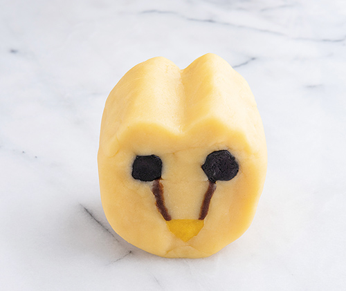 切りやすい固さになるまで冷蔵庫で解凍し、0.7〜0.8cmにスライスする。くちばしの上に2カ所竹串を刺して鼻の穴を開け、目と目の間に線を引く。