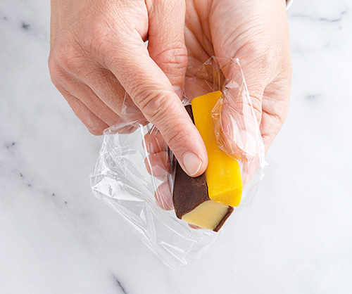 (17)の上に(16)を横にしてのせ、ラップごと包む。残りのGの肉づけパーツで反面も覆う。
