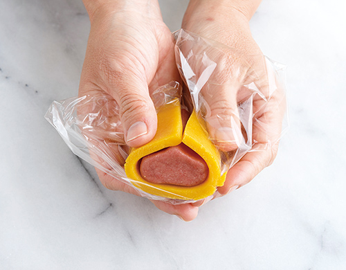 指先で頭と体の隙間を埋めるようにして境目をなじませ、ラップで覆い全体の形を整える。