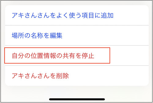 最初に選択した共有終了時間を待たずに位置情報の共有をやめたい場合は、画面最下部の「自分の位置情報の共有を停止」をタップします。「位置情報の共有を停止してもよろしいですか?」というメッセージが表示されるので、それをタップすれば、相手は自分の位置情報を見られなくなります。