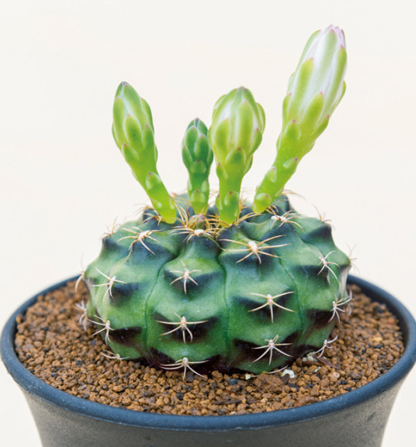 丸い形が人気の球形のサボテンは「玉サボテン」とも呼ばれます。特定の属が決まっているわけではなく、球形のサボテンはさまざまな属で見ることができます。生長するとやや細長く伸びて樽型になるものもありますし、子株がよくついて群生するものもあります。日照不足になると間のびしやすくなります。
