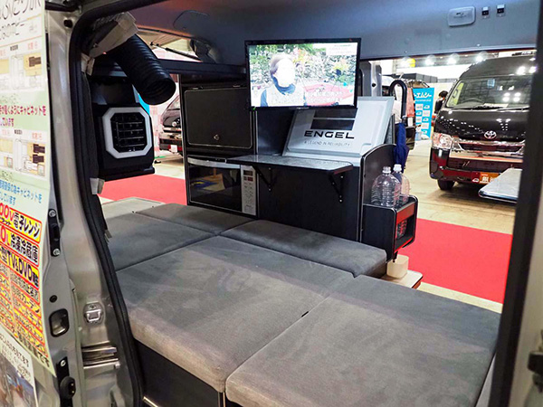特に見逃せないのがサブバッテリーで、2000Wインバータを備えた大型のものを搭載して電子レンジが使えるようにし、さらに冷蔵庫も40Lの収容量を備える上開きのものとしている。ベッドは背が高い人でも対応できるよう、前席シートのすぐ後ろに延長用マットも追加できる設計。TVも19型の少し大きめのサイズとしている。さらにスポットクーラーの装着も可能と、1人で過ごす場合に何が必要なのかをしっかり見極めた上での装備となっているのだ。