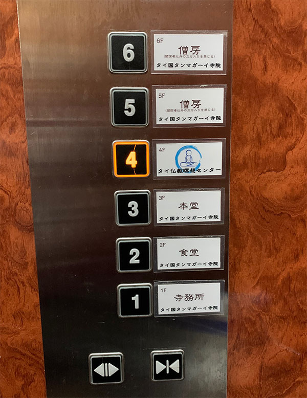 エレベーターの階数表示を見ると、1階は寺務所、2階は食堂になっています。くいしんぼうなので、食堂に興味津津です。3階はタイの方々や僧侶の瞑想フロア、5階と6階はお坊さんたちの宿坊のようです。つまり、このビルにはお寺のすべてがそろっているのです。