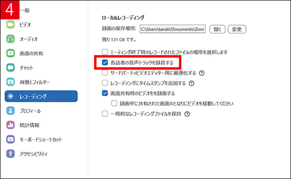 (4)音声ファイルを参加者ごとに保存したいときは、アプリの「設定」→「レコーディング」で「各話者の音声トラックを録音する」にチェックを入れればいい。