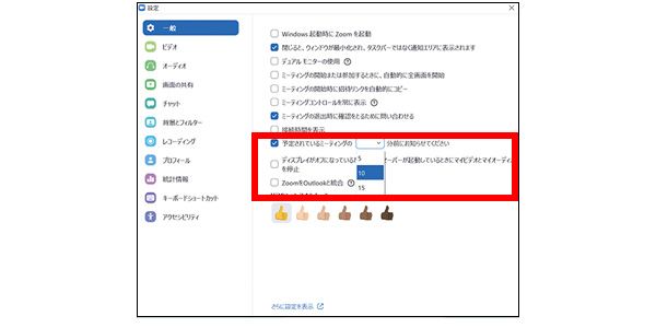 アプリの「設定」を開き、「予定されているミーティングの○分前に~」にチェックを入れる。○分の部分をクリックすると、5分/10分/15分から通知のタイミングを選べる。
