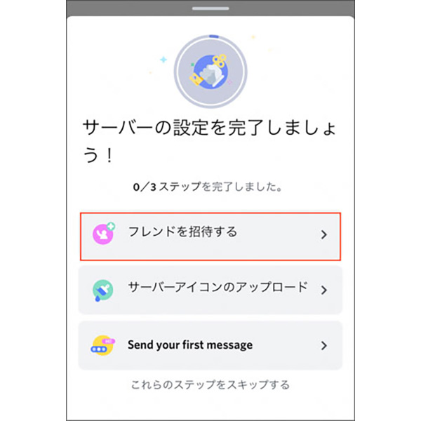 サーバーで交流する友達を招待するには、そのサーバーの「〇〇(サーバー名)へようこそ」の画面で、「サーバーを設定」→「フレンドを招待する」をタップ。招待用のリンクが表示されるので、これを友達に知らせましょう。