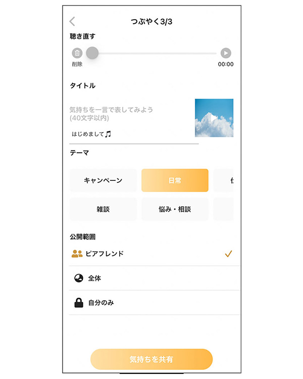 投稿の録音は、アプリの「つぶやく」画面から簡単に行えます。公開範囲は、すべてのユーザーが聞ける「全体」、相互相互フォローの人だけに公開する「ピアフレンド」、特定のフレンドへの限定公開から選択が可能です。