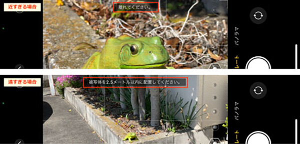被写体までの距離が近すぎる場合は、画面上部に「離れてください」と、遠すぎる場合は「被写体を2.5メートル以内に配置してください」と表示されます。自分が移動するか、被写体を動かすかして距離を調整しましょう。
