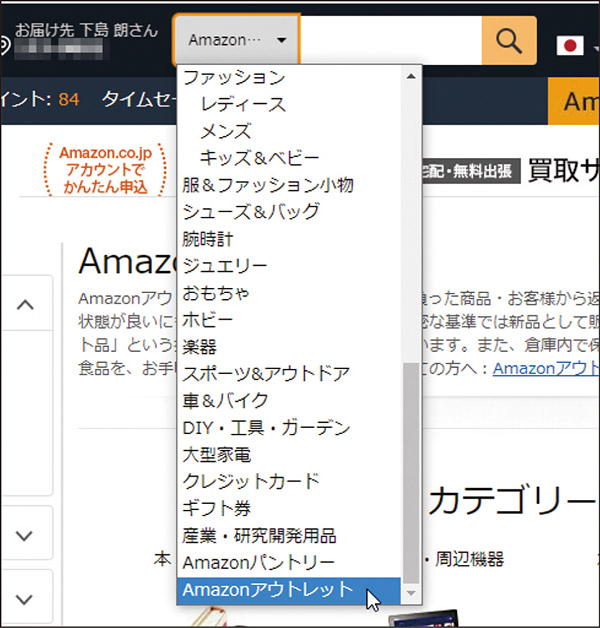 Amazonトップページ上部の検索枠左側のメニューから「Amazonアウトレット」を選ぶ。下にスクロールすると、よくある質問を確認できる。