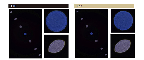 実際にぼけディスクチャートを撮影しても、きちんとF2.0、F2.8、F5.6、F16でぼけの形がほぼ真円になっているのがわかります。
