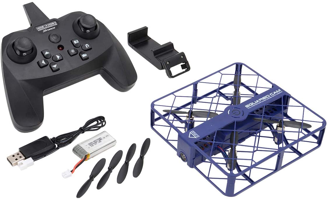 全面プロペラガードで覆われたプロペラ内蔵のボックス型ドローン。搭載されている1280ドット×720ドットのHDカメラは、飛行前に手動で角度を調整できる。専用操縦機が付属しておりモード1/2の切り換えが可能。操縦機にスマホを装着すれはリアルタイム映像を楽しむこともできる。