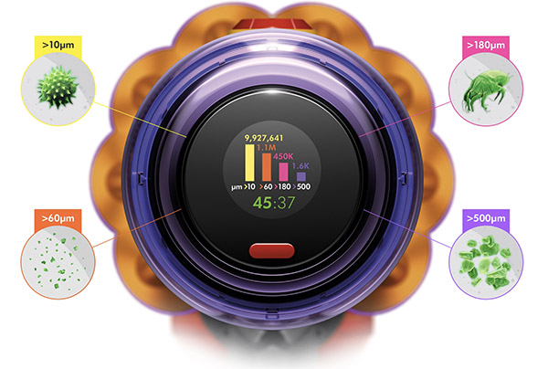 500μm以上(砂糖やノミの大きさ。肉眼で判別可能)、180μm以上(黄砂、ハウスダストレベル。極めて見えにくい)、60μm以上(微細なホコリ、剥がれ落ちた人の皮膚など)、10μm以上(花粉など)の4グループに分け、モーター後ろの液晶ディスプレイに表示されます。自分の部屋が何によって汚れているかが分かります。