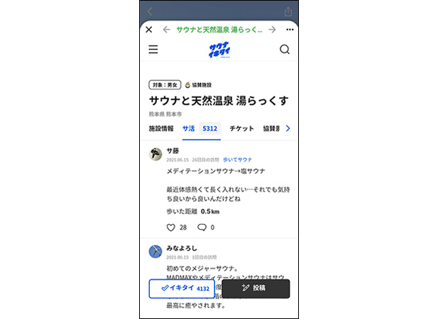 「サウナイキタイ」のサイトが開き、ここでサウナのスペックやレビューなどの詳細を読むことができる。