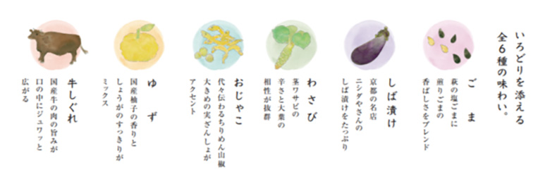 おいなりさんの味わいは、京都ならではの厳選素材を使った6種類。どれから食べようか迷ってしまいそう。