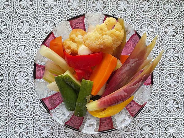 味がなじみ、食べごろになったピクルスです。みょうがは酢の酸で色素(アントシアニン)が鮮やかな赤紫色に変化しました。カラフルで鮮やかな彩りが食欲をそそります!